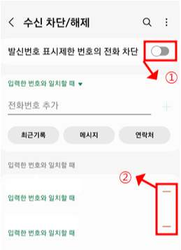 1번 버튼을 활성화 시켜주면 발신 번호가 제한된 번호는 수신 되지 않습니다.