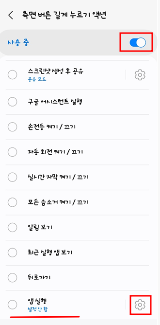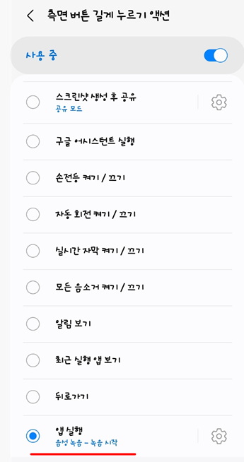 측면 버튼 길게 누르기 액션-> 비활성화 되어 있는 사용 중 활성화-> 앱 실행 옆 톱니바퀴 설정 클릭->음성 녹음 옆 톱니바퀴 설정 클릭-> 녹음 시작을 누르고 나면 음성 녹음 시작이 표시됩니다.